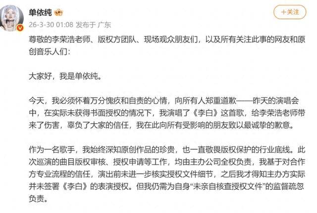 3月30日凌晨,单依纯又发了长文道歉,承认是自己没亲自核查授权文件,监督不到位。