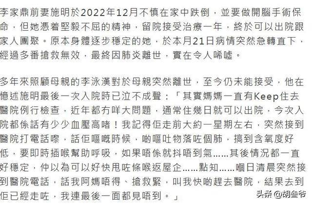 前夫李家鼎得知死讯后,悲痛不已,有媒体拍到他去寺庙为施明祈福,只是面对媒体的追问,他始终没有公开回应家庭矛盾的细节。