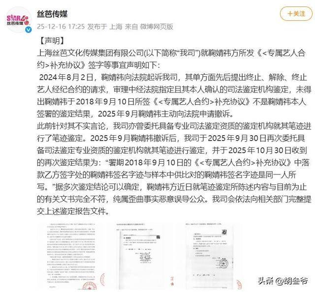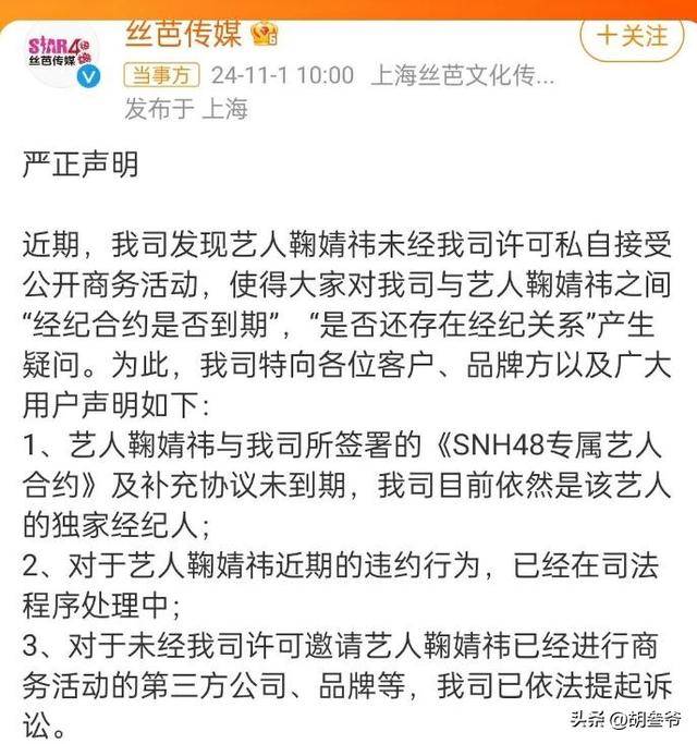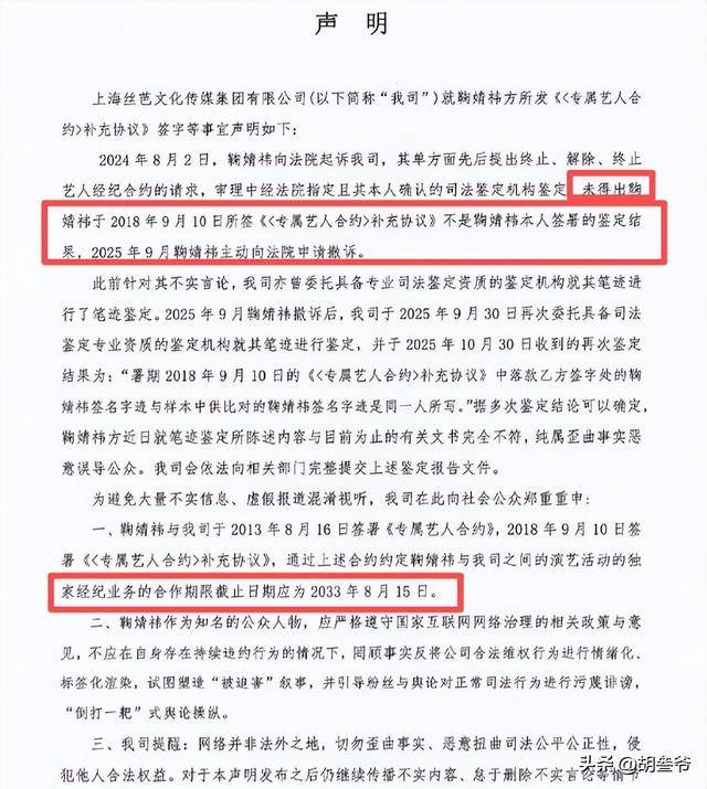 2024年6月18日,原合约到期当天,鞠婧祎方直接发布“不续约声明”,指控丝芭伪造补充协议的签名,双方的纠纷正式进入司法程序。
