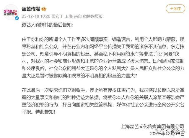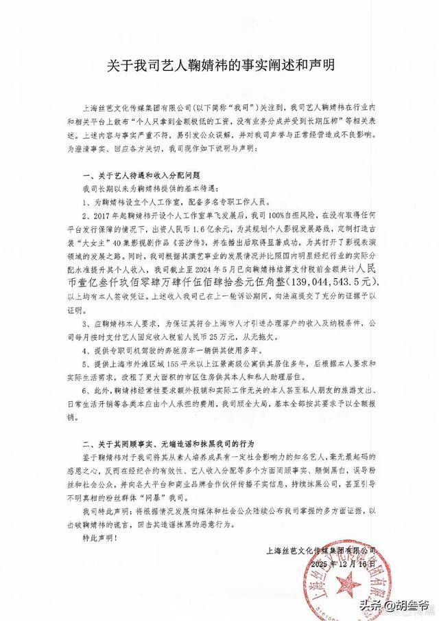 丝芭在2025年12月公开了十年间向鞠婧祎支付税前1.39亿元的凭证,还称每月支付25万元固定收入,为她提供奔驰房车和上海外滩的江景公寓。