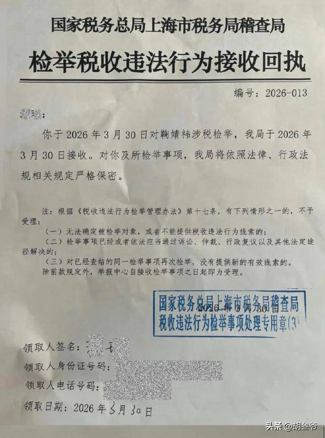 2026年3月30日,国家税务总局上海市税务局稽查局出具了编号2026-013的《检举税收违法行为接收回执》。