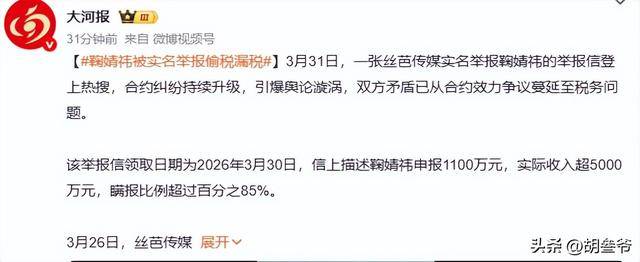 鞠婧祎被老东家丝芭传媒实名举报涉嫌偷税漏税,税务部门已经正式受理核查。