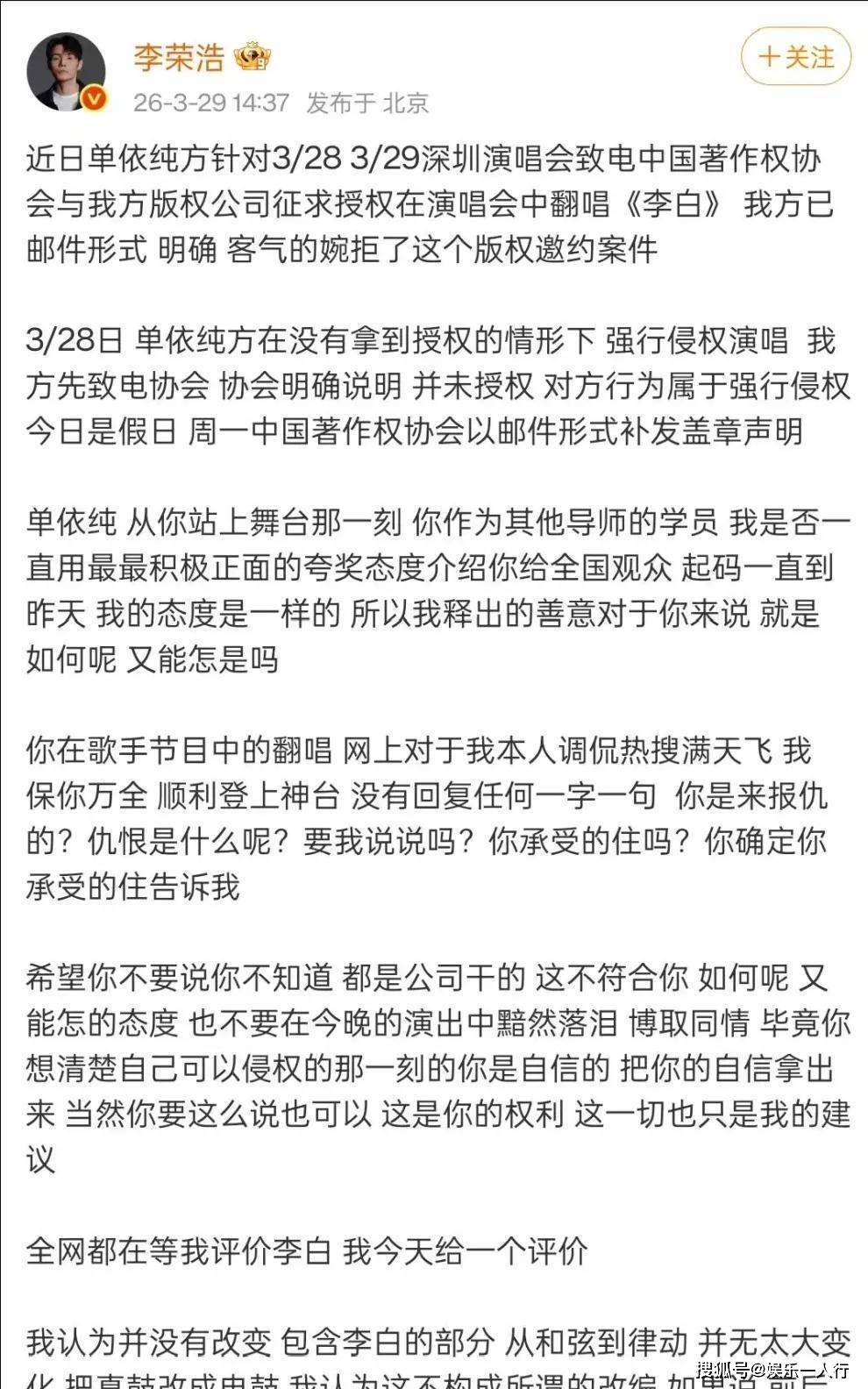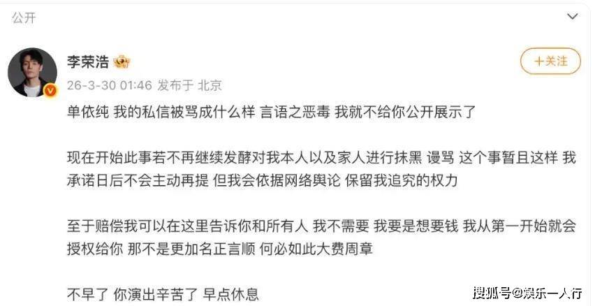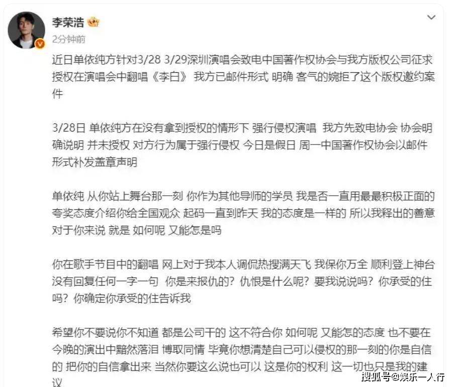 李荣浩在凌晨1点46分的回应,揭开了这场纠纷更残酷的一面。他首先提到自己的私信被单依纯的粉丝“骂成什么样,言语之恶毒”。网络暴力成了压垮骆驼的又一根稻草。他明确表示,自己不在乎赔偿,“我要是想要钱,我从第一开始就会授权给你,那不是更加名正言顺”。这句话彻底将事件性质从商业纠纷,提升到了对创作者尊严和行业规则的捍卫。他拒绝授权,根本不是钱的问题。他在之前的发文中甚至略带讽刺地评价了单依纯在《歌手2025》中对《李白》的改编,认为只是“把真鼓改成电鼓”,“换了个书皮”,本质没变。这种艺术评价上的不认可,或许才是他拒绝授权的深层原因之一:我不认可你的演绎,所以给钱也不让唱。
