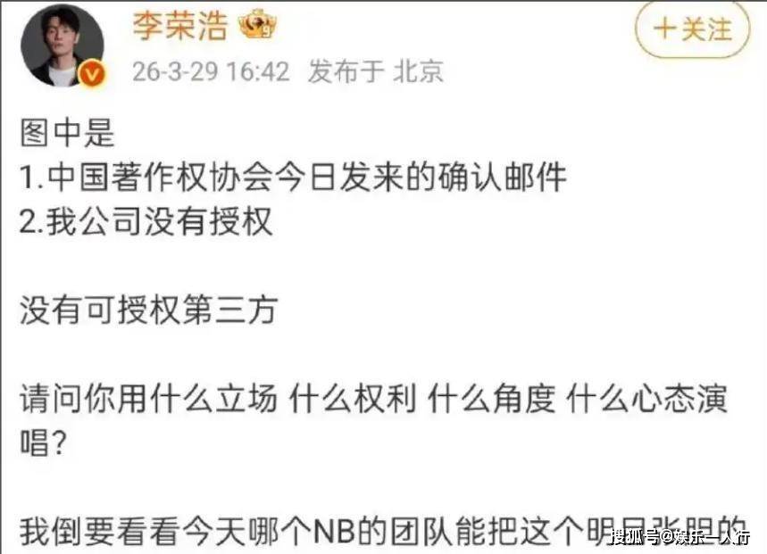 3月27日收到明确拒绝的邮件,3月28日照样登上深圳的舞台开唱。 这不是什么“工作疏忽”能解释的,在李荣浩看来,这就是一次明目张胆的“强行侵权”。他晒出了中国音乐著作权协会(音著协)的确认邮件,白纸黑字写着“未就该作品发放任何授权”。一场普通的商业演唱会翻唱,硬生生演变成了全网围观的法律纠纷和情感对决,李荣浩连发两条博文,把证据拍在台面上,四连质问单依纯“用什么立场、什么权利、什么角度、什么心态演唱?”他的愤怒几乎溢出屏幕,因为这件事触碰的远不止法律红线。