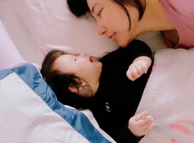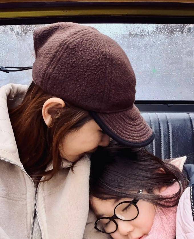 最新图片显示Bambi偎依着母亲的怀抱入睡,陈怡蓉深情地注视着自己的女儿,照片十分温馨。