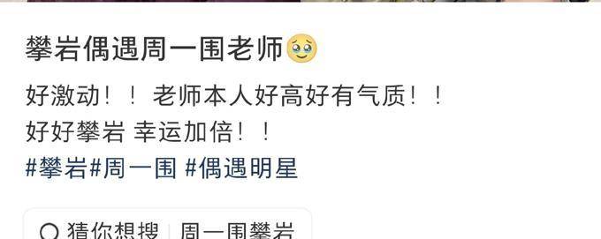 那个拍合照的网友特别激动,在网上发文说周一围本人个子很高还特别有气质,好好攀着岩还能遇到明星,简直是幸运加倍了,这位网友还配上了相关的话题。