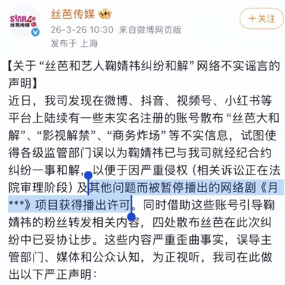 结果当时丝芭直接发文,表示“丝芭和鞠婧祎纠纷和解”是不实谣言。