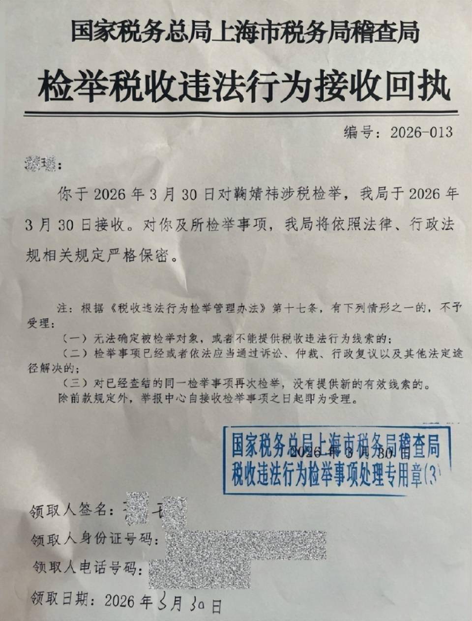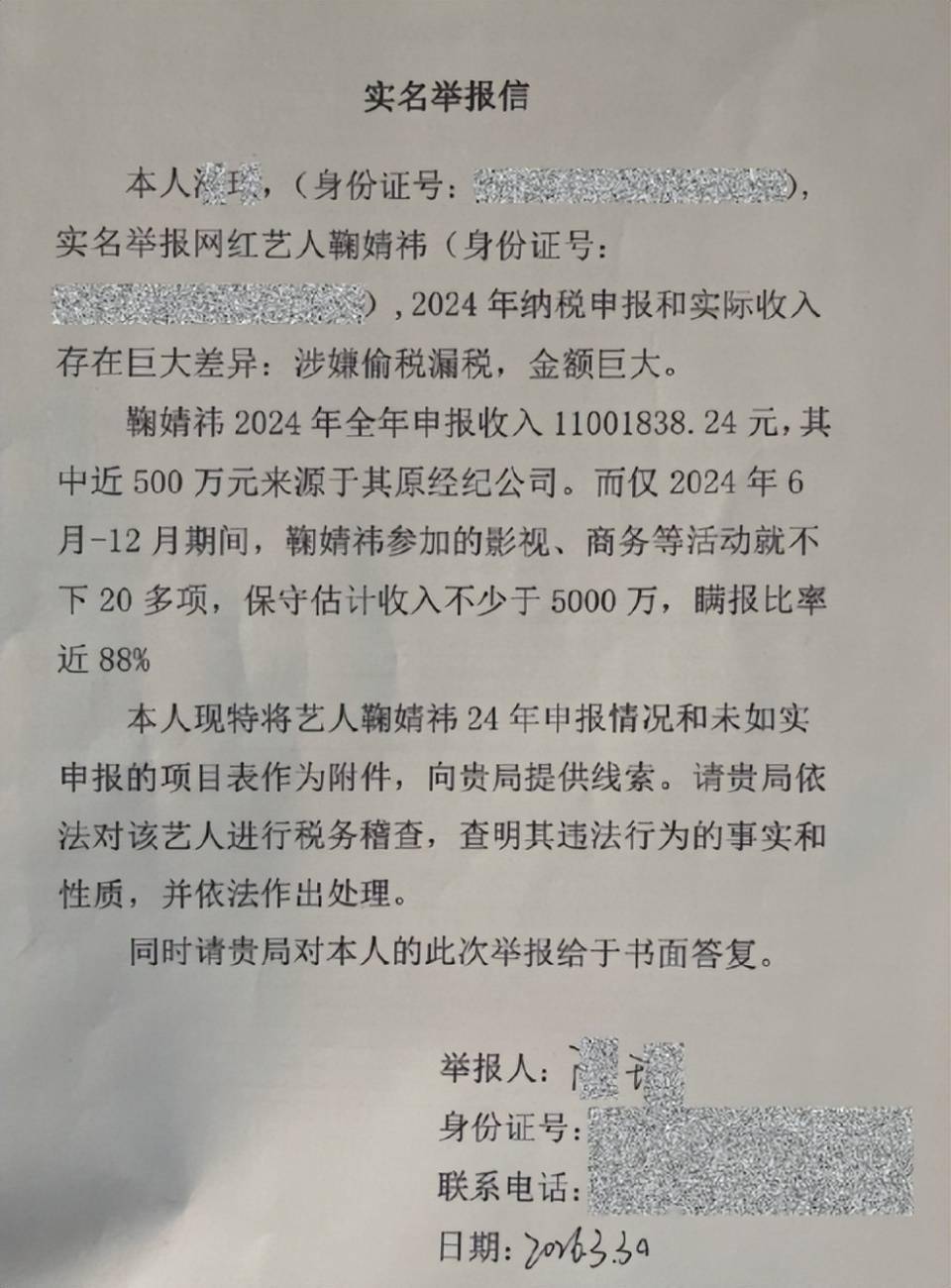 根据网友放出的实名举报信,这次举报针对的是鞠婧祎两年前的缴税问题。