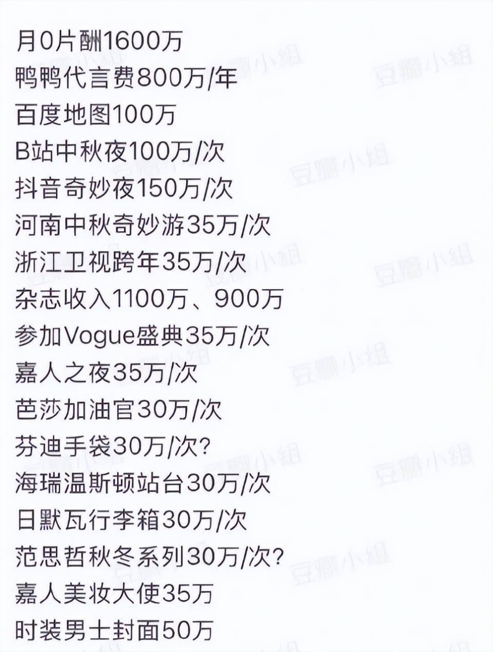 一次网络晚会,就能拿到上百万,卫视跨年活动唱唱歌是35万,而杂志收入,拍拍照片竟然就上千万。