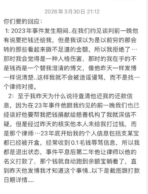 吴楚一称因支付宝账号长期遭网暴骚扰,频繁收到0.1分钱辱骂转账,他没登录账户而未及时发现款项,直至2026年3月29日陈牧驰发博回应争议后才核查确认。
