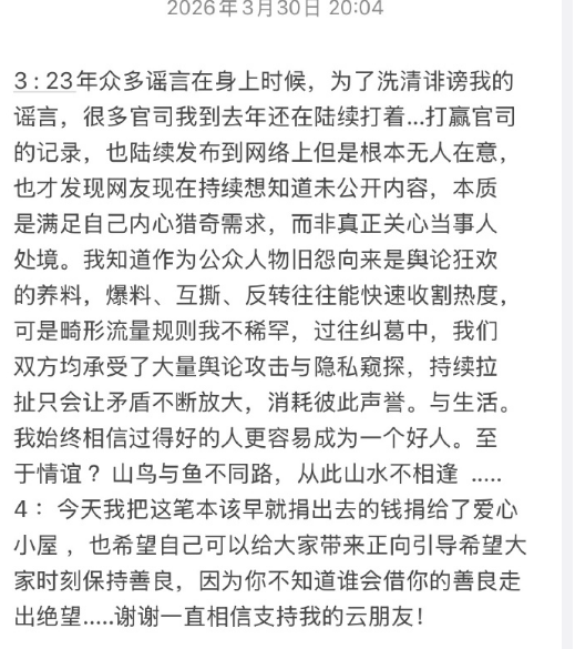他声明捐款是为“彻底终结纠葛”,并呼吁公众“保持善良,给绝望者带来希望”。