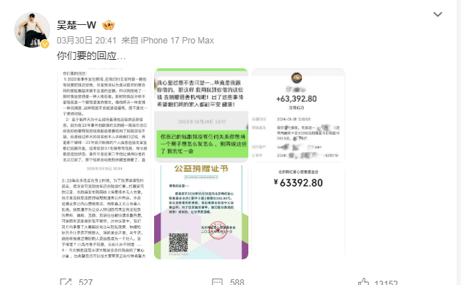 吴楚一在2026年3月30日公开声明,已将陈牧驰委托律师归还的63,392.80元欠款全额捐赠给韩红爱心慈善基金会的“童伴小屋”项目,并晒出捐赠证书,为持续三年的经济纠纷