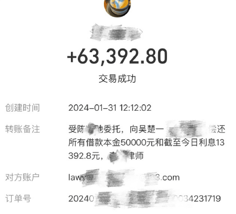 2024年1月31日,陈牧驰通过律师向吴楚一转账63,392.80元,其中包含5万元本金及13,392.8元利息,转账备注明确标注“偿还所有借款本金及利息”。