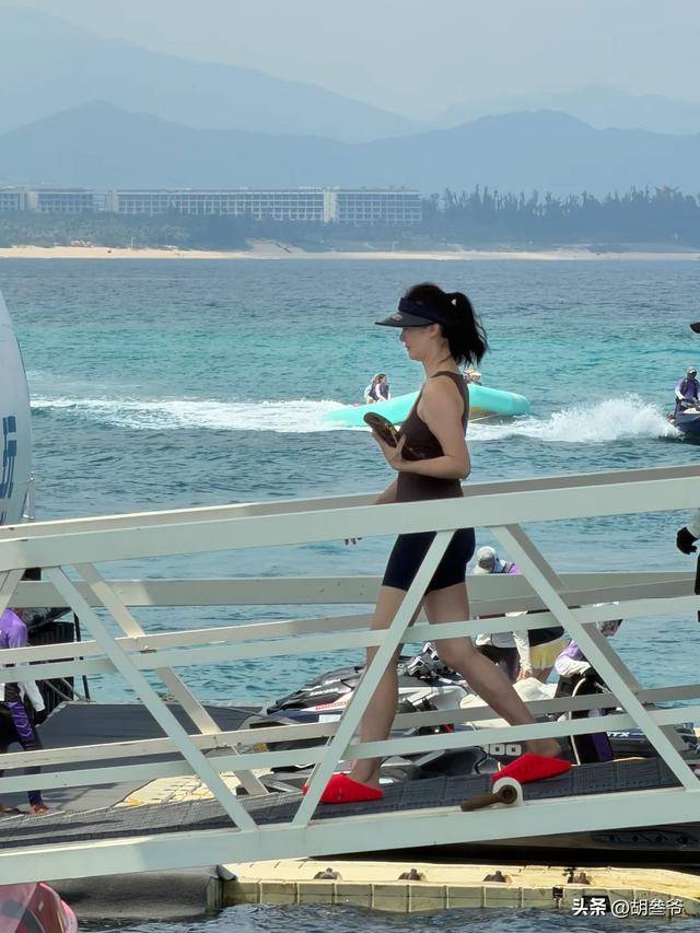 齐溪则穿得比较凉爽,一身黑色泳装搭配红色拖鞋,大秀身材,不过身高很高但腿不算长,加上发福,少了几分精致感,多了几分生活化的松弛。