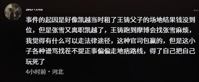 有知情的网友说这件事的起因是凯越租了王涛父子的场地,但结果钱没有到位,张雪又离开凯越了,他又跑到摩博会找张雪的麻烦。