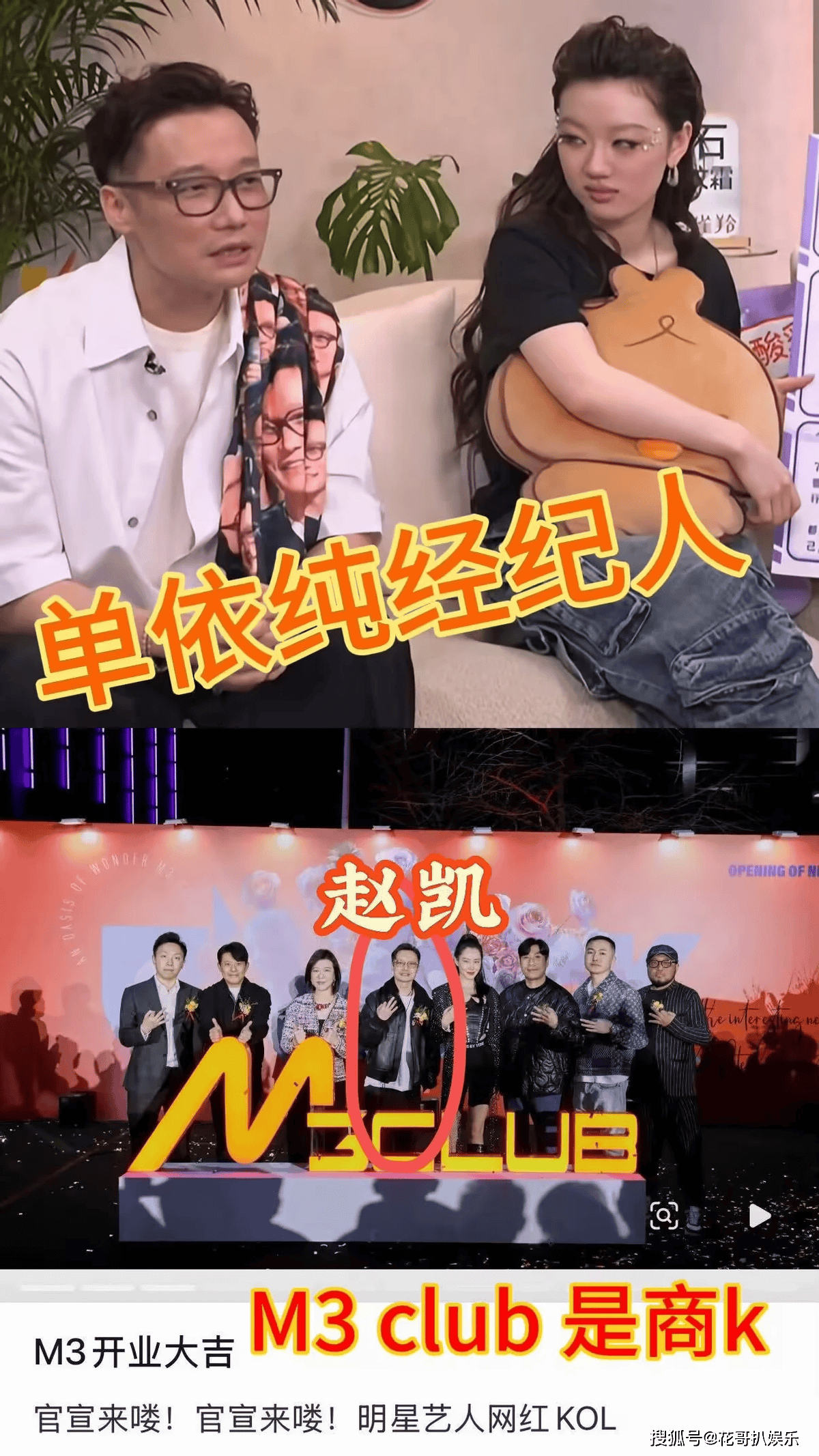 单依纯的经纪人名叫赵凯,可能很多人没听说过这个名字,但他确实是圈内大佬了,也是百沐娱乐的老总,粗略估计身家能有几个小目标,名下还有个百沐系餐饮娱乐公司,关键就是这个餐饮娱乐公司,公司旗下有一个夜店品牌M3 CLUB。准确来说不是夜店,而是商K,就是前两天上了丑闻的那个商K。