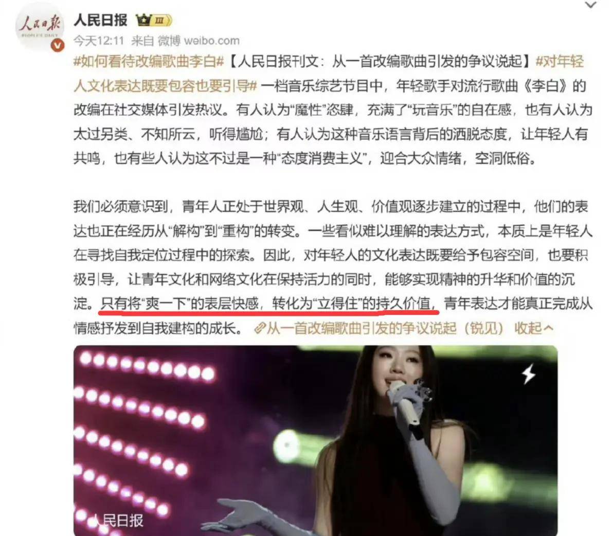 人民日报曾经就点评过单依纯对《李白》的改编,当时人民日报就给单依纯提醒了,希望她能将“爽一下”的表层快感,转化为“立得住”的持久价值,这样才能完成