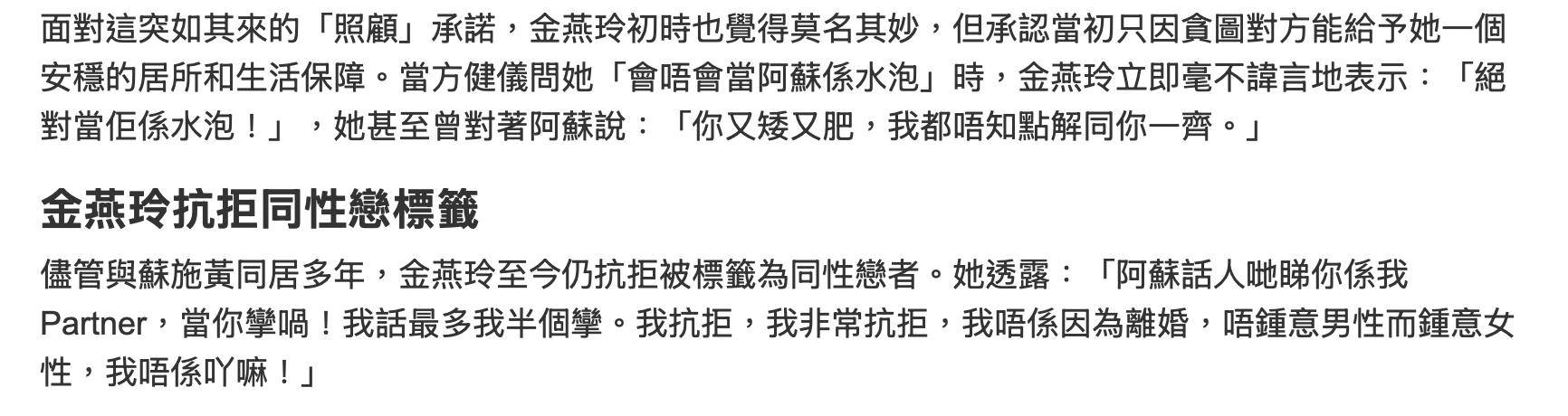 金燕玲在接受方健仪访问的时候,罕见谈及了与苏施黄的关系,更很详细地剖白了两人从相识到同居的一些细节。她称当年在结束第二段婚姻之后,她从英国返回香港,那时候经济拮据,前路茫茫,而在一次麻将局中,她与苏施黄打牌,并且讲述了自己的困境,没想到苏施黄就心生怜悯,并直接对金燕玲称,觉得她好惨,想要照顾她,连房子都给她。金燕玲在困境之中,突然有人伸出援手,并且愿意照顾自己,那是一阵感动,当然她也觉得莫名其妙,只是当时实在太难了,于是她就贪图对方能给她一个安身之所,以及生活保障,所以就与对方同居了。