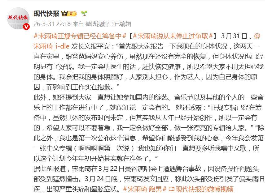 一句“虽然现在还没有完全的恢复,但已经明显有了好转”,让无数揪着心的粉丝总算能稍微松口气。据3月31日晚间报道,因舞台事故受伤的宋雨琦发布长文,详细回应了近期的