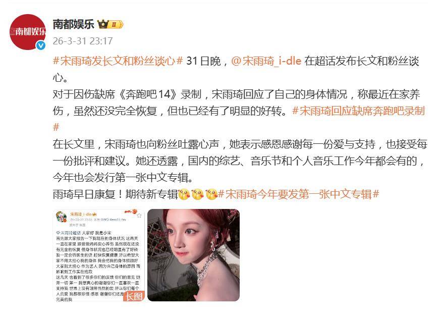 作为艺人,因身体原因影响工作让她深感抱歉,尤其是因此缺席了《奔跑吧14》的录制。但她显然没打算闲着养病——长文里,她一口气给粉丝喂下了好几颗“定心丸”。
