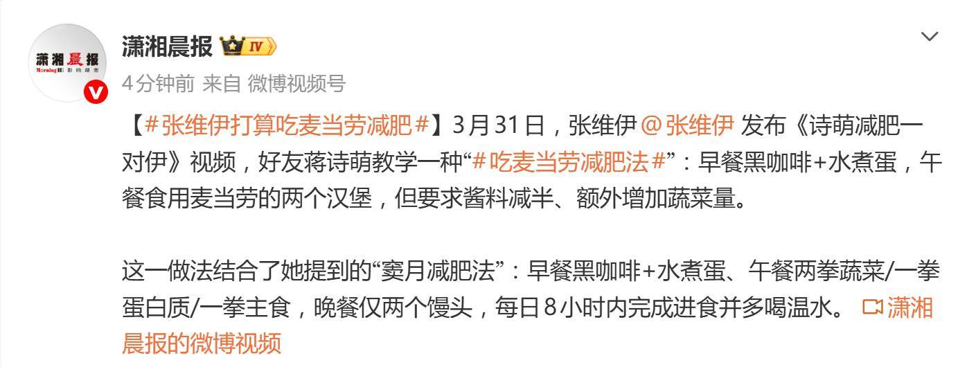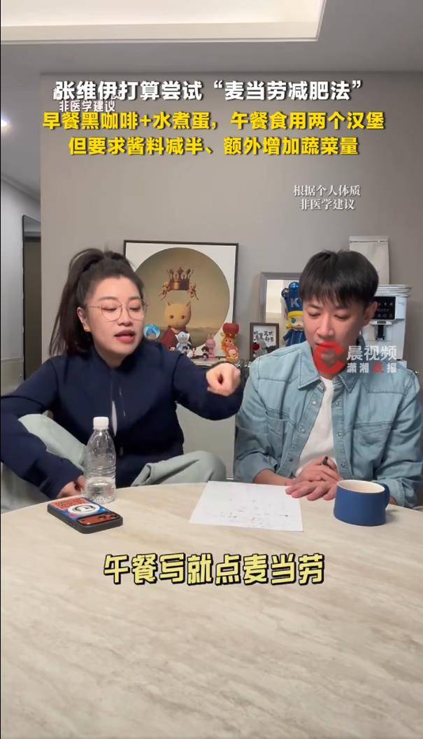 据4月1日报道,3月31日,演员张维伊发布的一则《诗萌减肥》视频,在网友中炸开了锅。视频里,他的好友蒋诗萌亲自教学一种听起来有点“反常识”的“吃麦当劳减肥法&