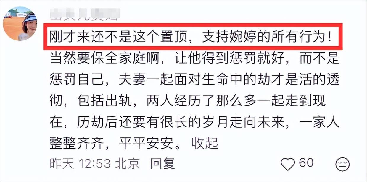 在此情形下,有细心网友发现,目前张婉婷还将这条动态直接置顶,似乎在向外界宣告,他们的婚姻依旧是坚不可摧,他们的感情更是不容外界置喙,Q女士虽然曾经占领过自己老公的身心,但到底自己才是最后的赢家。