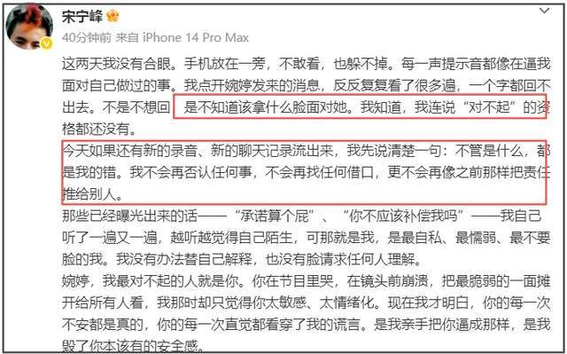 宋宁峰表示这两天的舆论都逼迫他面对出轨事实,不知道拿什么脸面面对张婉婷,没有说对不起的资格。坦诚如果还有聊天记录和录音曝光不会辩解,认清自己是个自私、懦弱的人。同时,还承认张婉婷在《再见爱人》中那些情绪化敏感的发言都是自己的谎言造成。