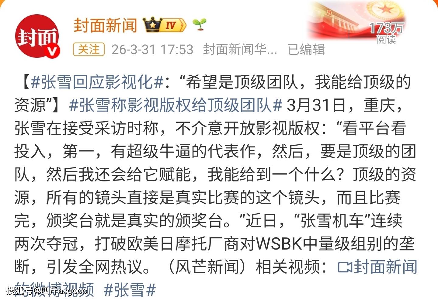 4月1日,摩托网红老板张雪的故事还在持续发酵。