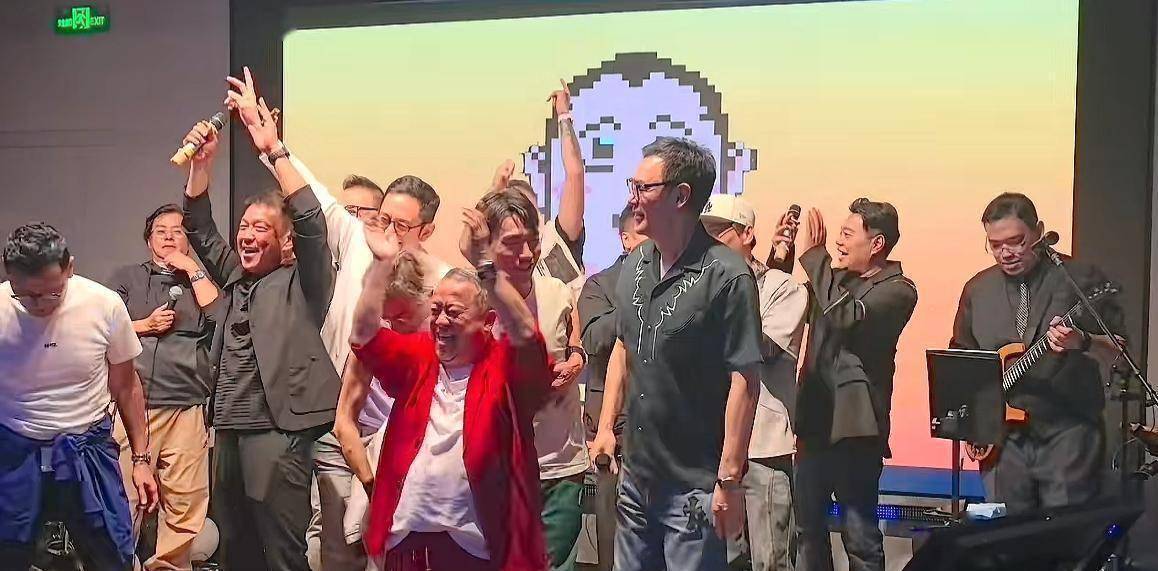 站在最前面、身穿红衣扭得最欢的,是72岁的曾志伟;他身后,是谭咏麟、苗侨伟、元彪、吴启华、钟镇涛这些陪伴了几代人青春的面孔。