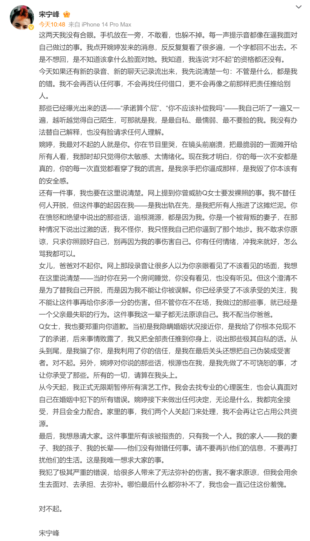 4月1日,宋宁峰的道歉信刷屏全网。没有辩解,没有推诿,字字句句都是对自己出轨行为的忏悔,对妻子张婉婷的愧疚,对女儿和第三者的歉意,甚至官宣无限期暂停演艺工作,以沉默和退隐承担