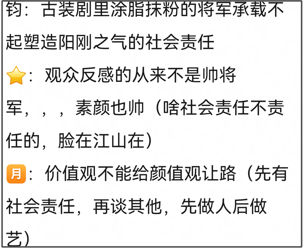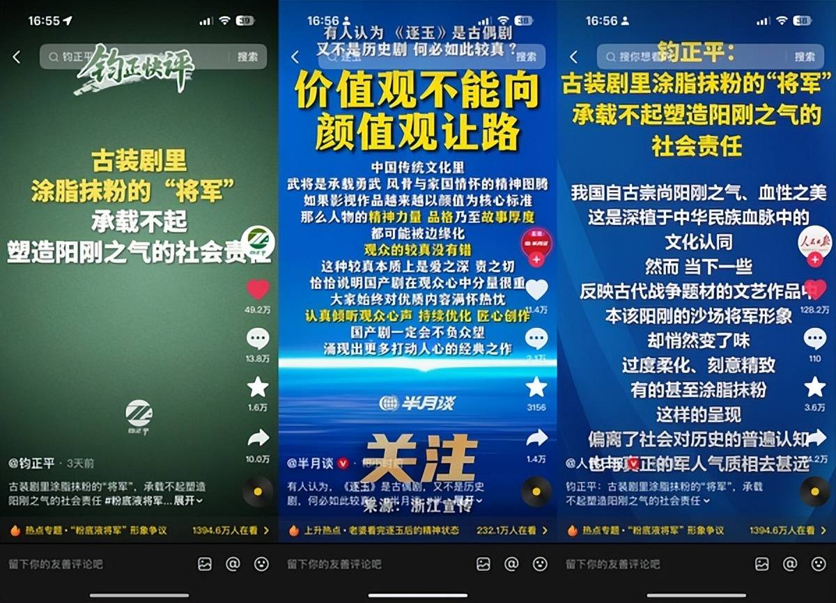 自从钧正平下场点评“粉底液将军”之后,更多官媒也下场发声点评,抵制这种审美。但粉丝似乎还在硬撑,想用《逐玉》是古偶剧来说事,再度遭到官媒回怼,“价值观不能向颜值观让路”。