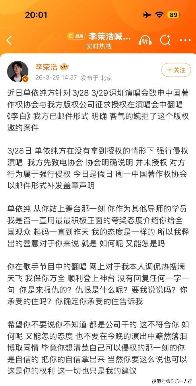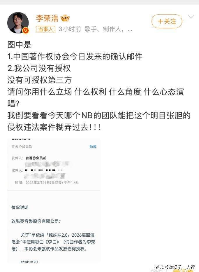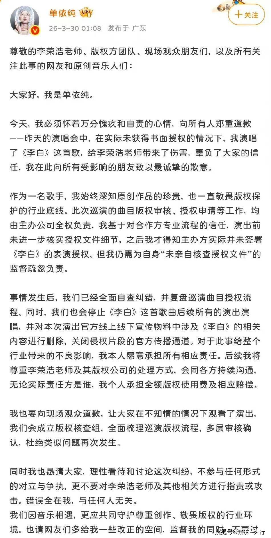 正是这种深度捆绑和长期投入,让赵凯在本次版权风波中选择了与众不同的应对姿态。事件本身很清晰:单依纯团队为深圳演唱会申请翻唱《李白》的授权,被李荣浩方通过邮件明确拒绝。但3月28日晚,单依纯仍在演唱会上演唱了这首歌。3月29日,李荣浩在微博晒出音著协的证明邮件,连发四问公开质问。单依纯在29日下午和30日凌晨两次道歉,承认团队监督疏忽,并承诺承担全部版权费用和赔偿。法律层面,这已构成明确的故意侵权。