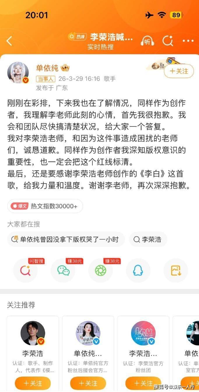通常剧情到此,应该是公司发个官方声明,和艺人一起道歉,然后等待赔偿谈判。但赵凯打破了这种常规。圈内流传的信息显示,他在朋友圈和经纪人微信群中发声,核心意思有两层:一是版权问题依法处理,该赔的赔;二是质疑李荣浩这种公开点名的方式,对年轻艺人是否过于严苛,并明确表示“百沐娱乐虽然不是巨头,但也不是软柿子”,会全力保护单依纯。随后,百沐娱乐与联合主办方阔景音乐发布了正式的道歉信,承认流程疏漏,承诺整改。赵凯的表态,在认错和承诺赔偿之外,额外附加了一层情绪价值和立场宣示:我们认错,但我们不认怂。