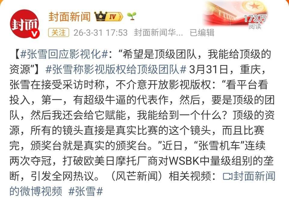 张雪在重庆接受采访时,被问到会不会开放自己故事的影视版权。
