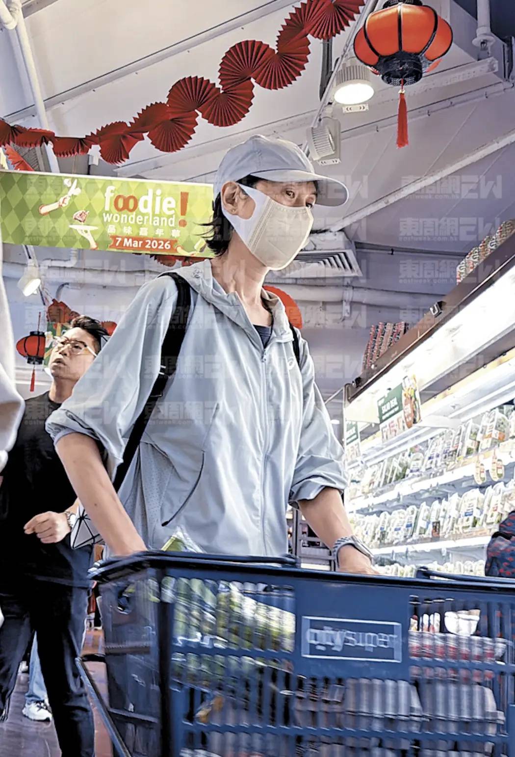 58岁的郭蔼明现身超市购物,她穿了一件浅灰色薄外套、搭配了浅蓝色牛仔裤。戴着口罩帽子,像是怕被认出来。