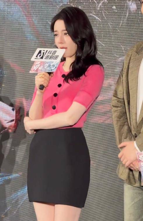 粉色上衣衬得她皮肤白皙透亮,黑色包臀裙完美凸显出她的腰臀比,又长又直的大长腿格外抢眼,腿部线条匀称有肉,不是干瘪的瘦,而是健康好看的线条感。
