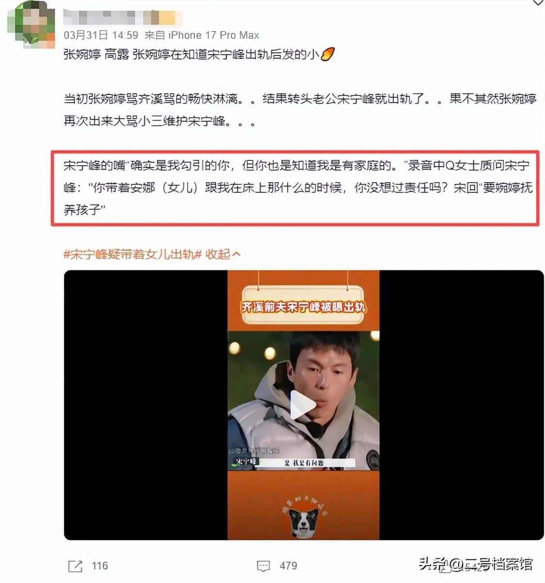 还要不要脸?演员宋宁峰当着女儿面做龌龊之事,正宫发不雅照威胁“三姐”,录音内容曝光令人作呕。