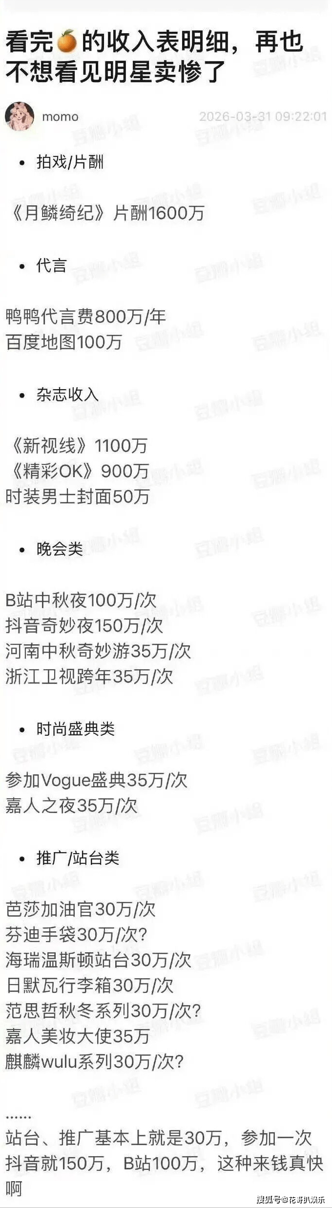 不过也因为这次的事,鞠婧祎的收入明细也被越来越多的人关注,明星的吸金能力也再次刷新了大众的认知。接一个普通推广拍三张照片就能赚三十万,跑一次站台露面十分钟收入高达一百五十万,只拍了两本杂志,加起来工作时间还不知道有没有八小时,就拿下了两千万的收益。从这个收入来看,内娱的影视寒冬也只是空谈,起码从收入来看,并不算寒冬。