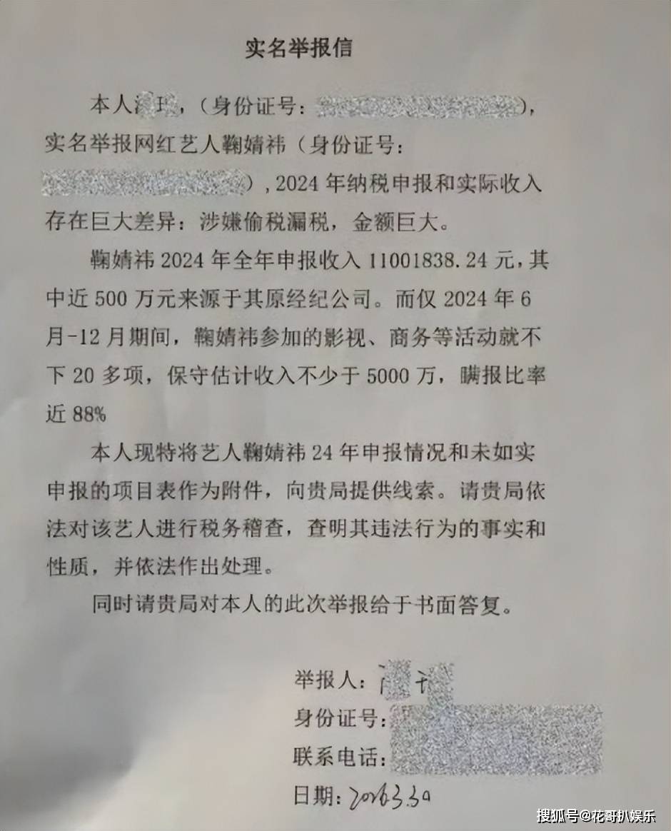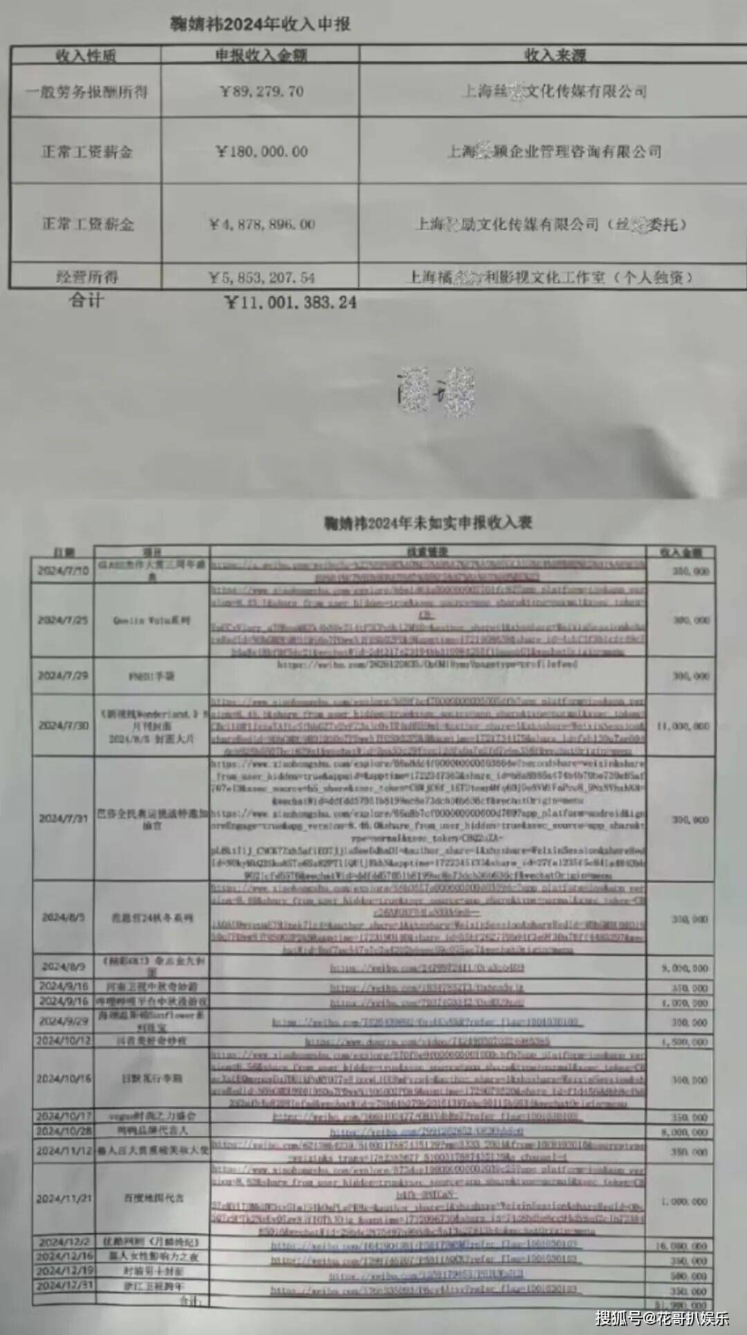 事情的起因源于丝芭传媒提交的一份实名举报材料,里面附上了鞠婧祎2024年6月到12月的收入流水。根据材料里的内容,鞠婧祎在这半年时间里,靠着拍戏、接代言、跑站台、参加晚会演出还有卖杂志,总共入账至少五千万元。而鞠婧祎2024年全年的纳税金额只有1100.18万元,其中五百万还是24年上半年还在丝芭期间,由公司代缴的部分。这么算下来,她离开丝芭后的这半年,赚了五千多万,却只缴了六百万的税,就算是不懂税法的人也能看出来这个纳税金额有问题。