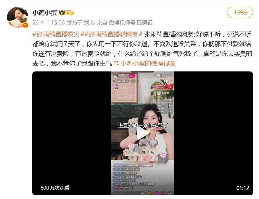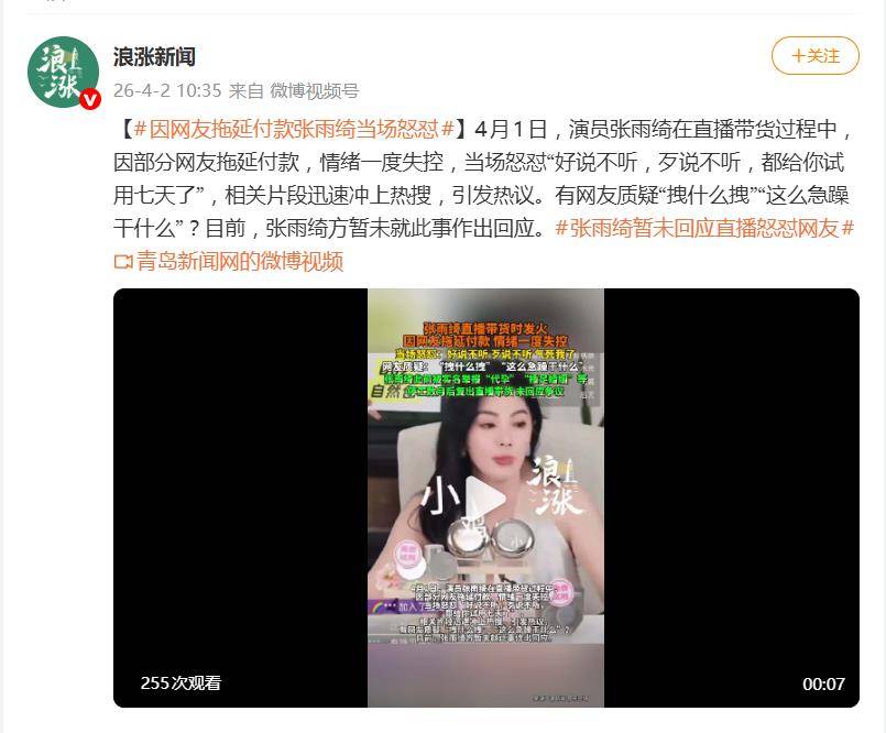 据4月2日报道,4月1日,演员张雨绮的直播间上演了一出“火爆”戏码。面对部分网友下单后拖延付款、反复质疑售后政策的行为,她情绪一度失控,当场怒怼:“好说不听,歹说不听!试用完退也行,不付款白送运费险?还想要什么?给个屁啊!”并直接表示“你去买贵的吧,我不管你了”。相关片段迅速冲上热搜,引发舆论两极震荡。