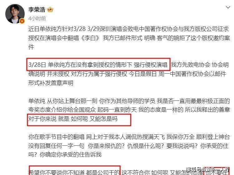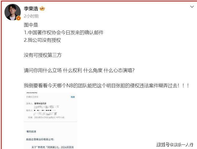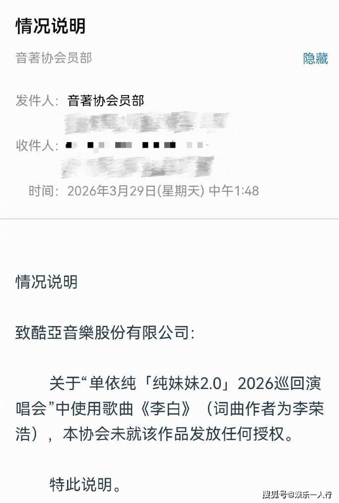 这事儿根本不是什么“团队疏忽”能糊弄过去的。单依纯方在演唱会前,明明已经通过中国音乐著作权协会(音著协)和李荣浩的版权公司去申请授权了,结果两边给的回复都是“不行”。邮件白纸黑字在那儿摆着,拒绝的意思清清楚楚。律师讲得很明白,商业演出翻唱,必须拿到词曲著作权人的个别授权,音著协只是个代管机构,版权人说不行,它就是不能发这个许可。所以,这不是“忘了查”,而是“查了,被拒了,然后还是唱了”。在法律上,这有个专门的词,叫“故意侵权”。单依纯在道歉文里把自己摘成“监督疏忽”,可事实是,她作为演唱会的“总监制”,对曲目有定稿权,对《李白》这种明确知道有版权争议的歌,不核死授权就上台,这责任怎么甩都甩不掉。