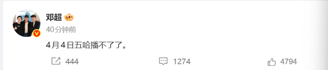 4月1日,邓超在个人社交平台莫须有的来了一句:4月4日五哈播不了了。没有任何的修饰词和解说理由,这么突如其来的一句没头脑的话,让《五哈》粉丝们倍感心慌,毕竟这次的录制,可谓期待感拉满。鹿晗回归,铁三角重组,哪个看点都值得期待,邓超忽然的播不了,让粉丝们很难接受呀!