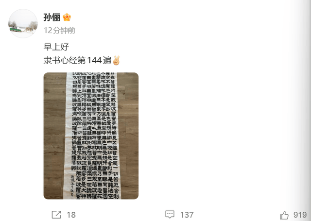4月2日,孙俪在个人社交平台晒出自己手抄隶书心经,看到孙俪的配文更是惊艳,这份心经已经是孙俪手写的第144遍了。看到孙俪的这份心经,思绪似乎又被拉回《甄嬛传》中,又看到那个深宫后院里有谋略懂诗书的嬛嬛。