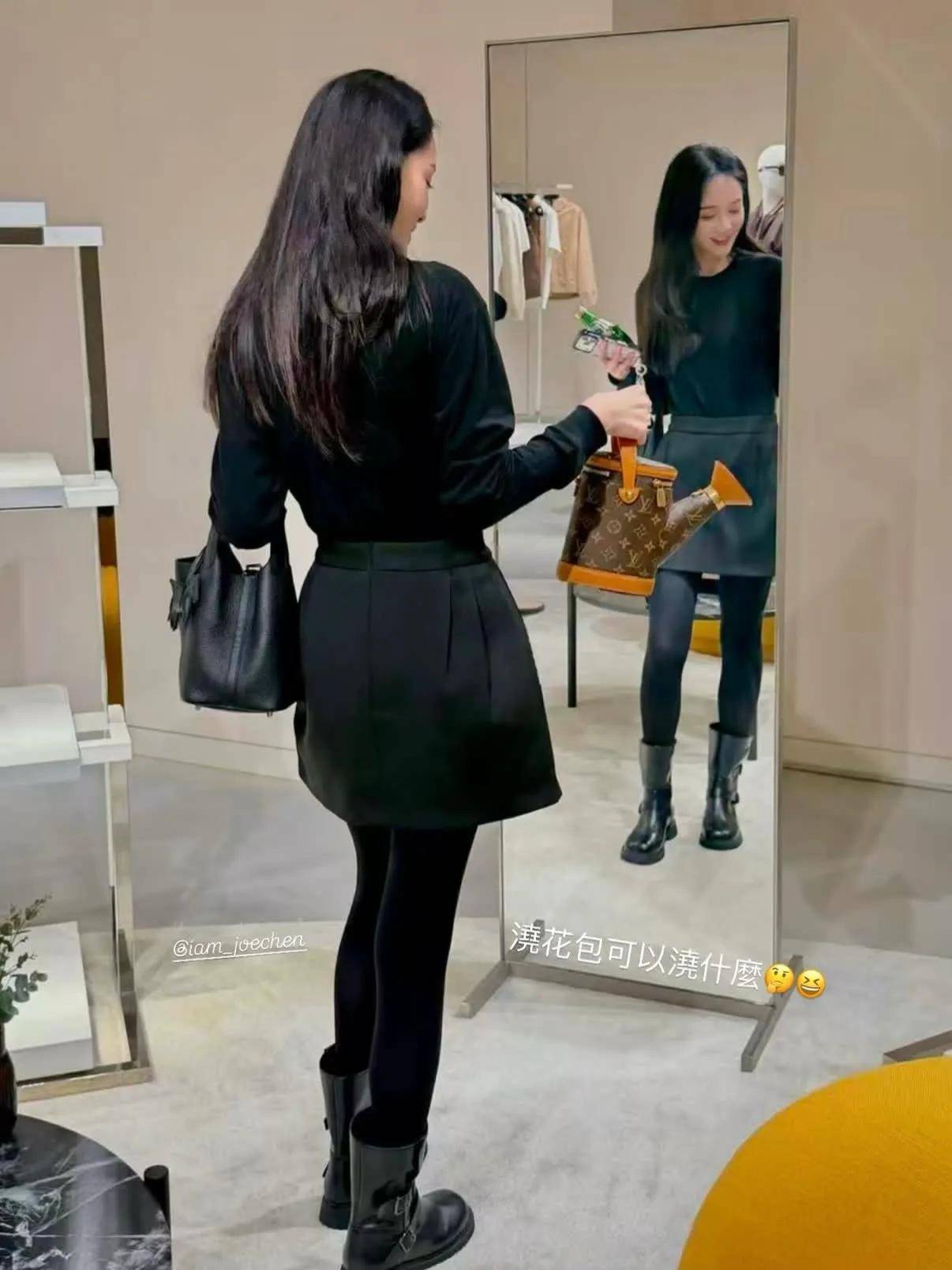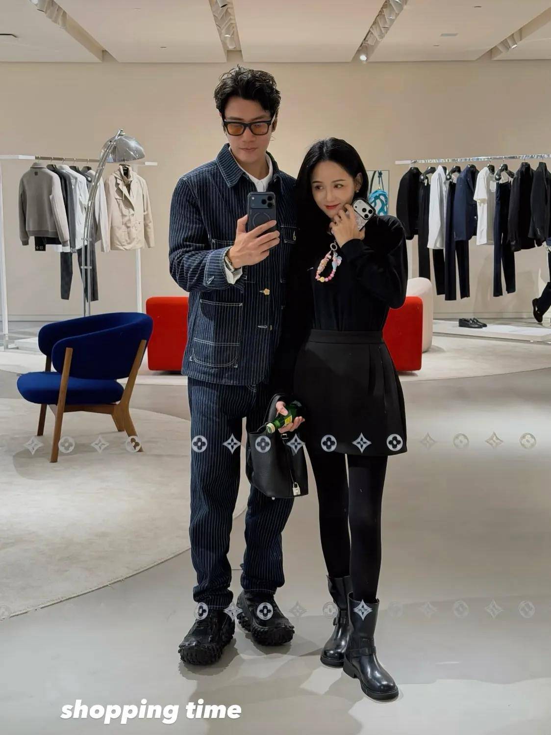 两人还一起去逛街买衣服,在店里试衣服,还对着镜子自拍,两人同款黑色,看起来登对养眼。陈乔恩看中造型特别的包包,拿着在镜子前试,Alan在后面拍下这个画面,不知有没有给老婆买下这个包包呢。
