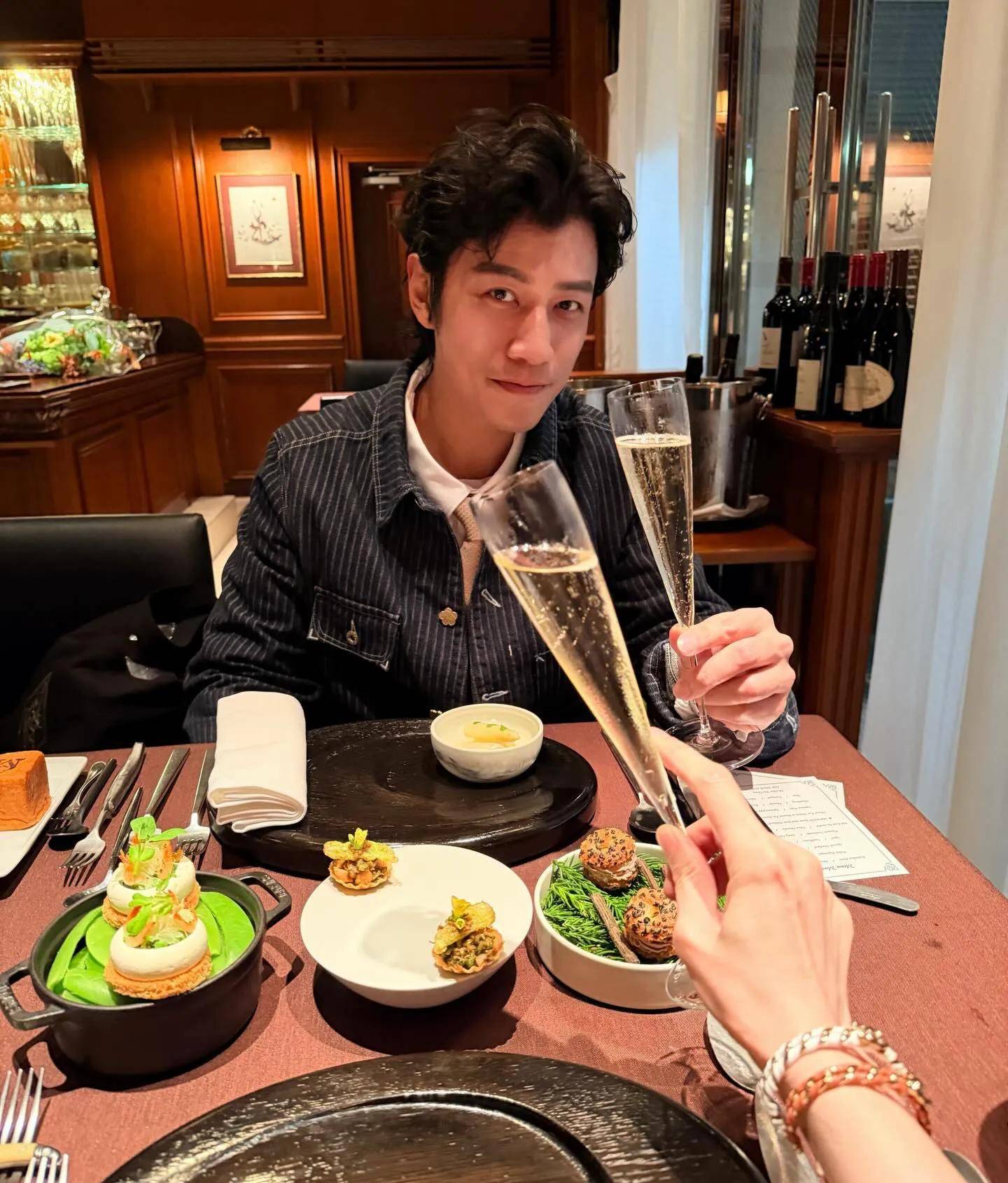 到了晚上,陈乔恩和老公一起去吃日料庆祝,陈乔恩换了一身白色裙子,打扮娇俏可人。Alan还是穿着那身深蓝色条纹套装,打扮帅气十足。两人一起举着红酒杯在餐厅自拍,看起来恩爱幸福。
