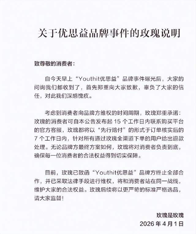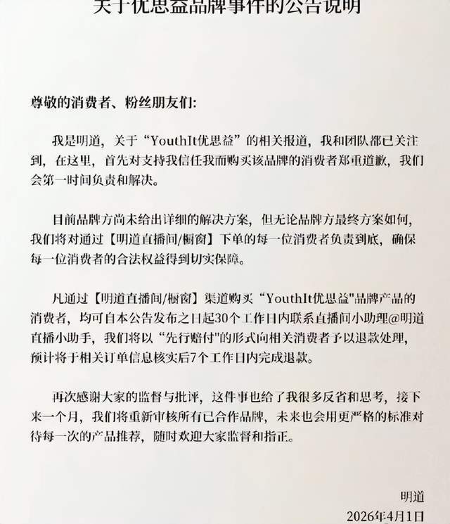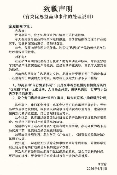李若彤更狠。4月1日致歉声明里写得清楚:无论何时购买,无论是否开封,全额退款,当天到账。还专门开了"彤享会"售后通道。