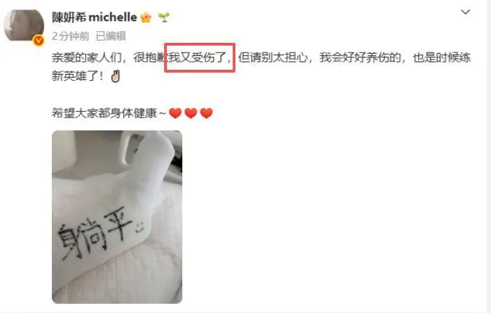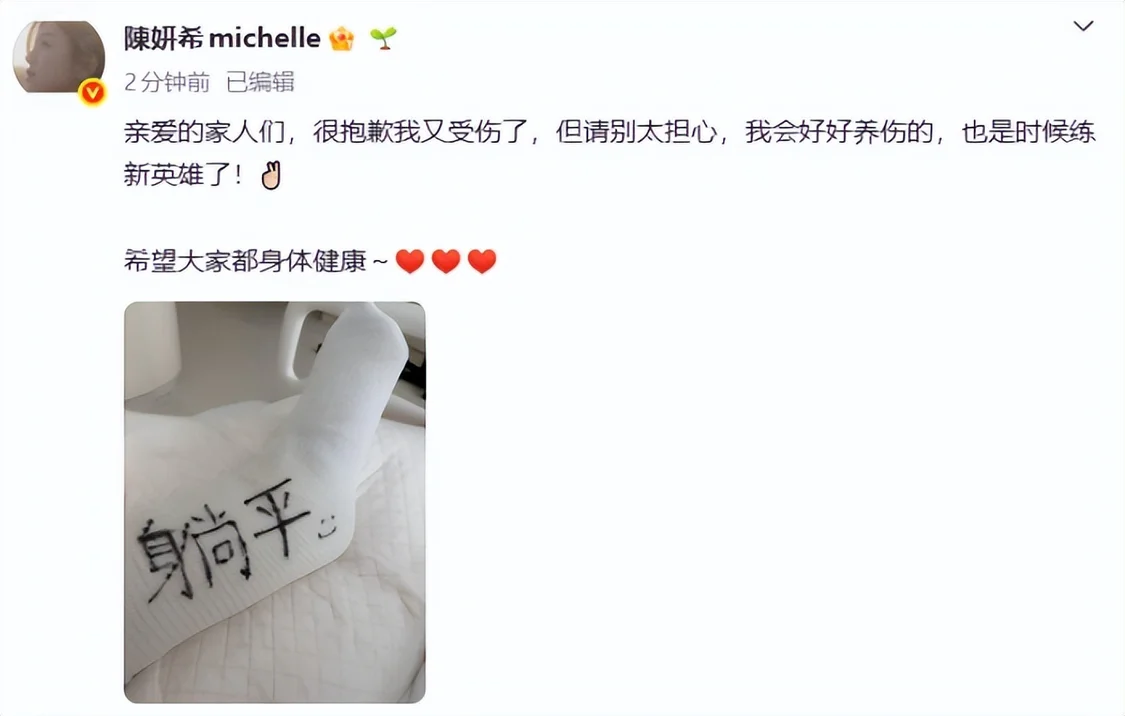 就比如这次,陈妍希自己也说:“又受伤了”。