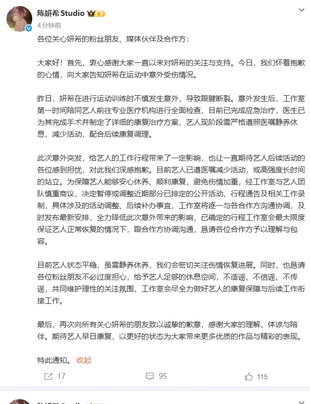 声明里提到,她的脚在运动时发生意外,跟腱断裂了。