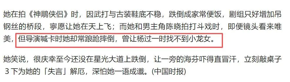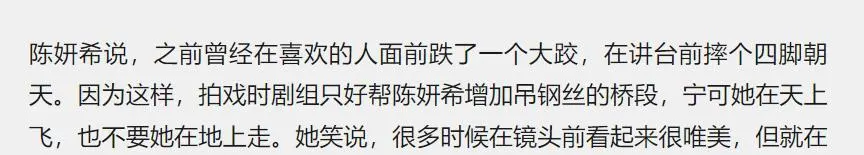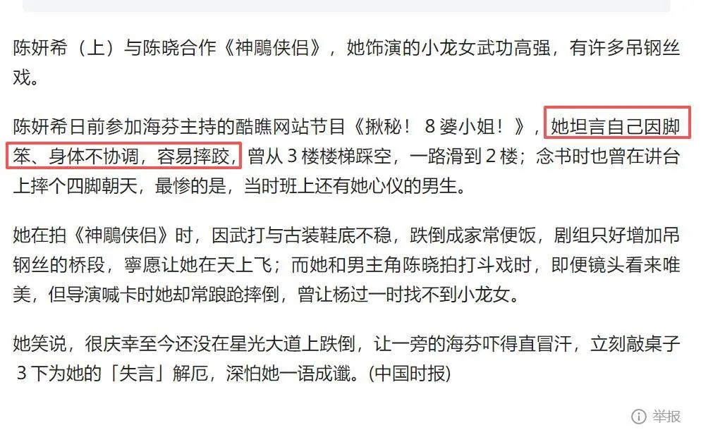 甚至陈妍希在拍《神雕侠侣》时,她还因为老摔倒被安排了很多飞天戏。