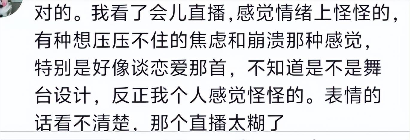 她昨天演唱会的气氛透露出了一种紧张和焦虑,没以前那种说很多话的环节了,惜字如金,唱歌也有点紧绷放不开。